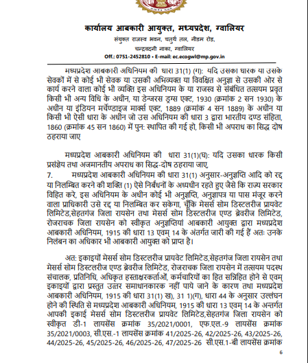 ग्वालियर। नकली शराब परिवहन परमिट और अवैध शराब की आपूर्ति से जुड़े गंभीर आपराधिक मामले में आबकारी आयुक्त, मध्यप्रदेश ने बड़ा प्रशासनिक कदम उठाया है। अपर सत्र न्यायाधीश देपालपुर द्वारा दोष सिद्ध होने के बाद सोम डिस्टलरीज प्रायवेट लिमिटेड, सेहतगंज (रायसेन) एवं सोम डिस्टलरीज एंड ब्रेवरीज लिमिटेड, रोजराचक (रायसेन) के सभी प्रमुख आबकारी लाइसेंस तत्काल प्रभाव से निलंबित कर दिए गए हैं।